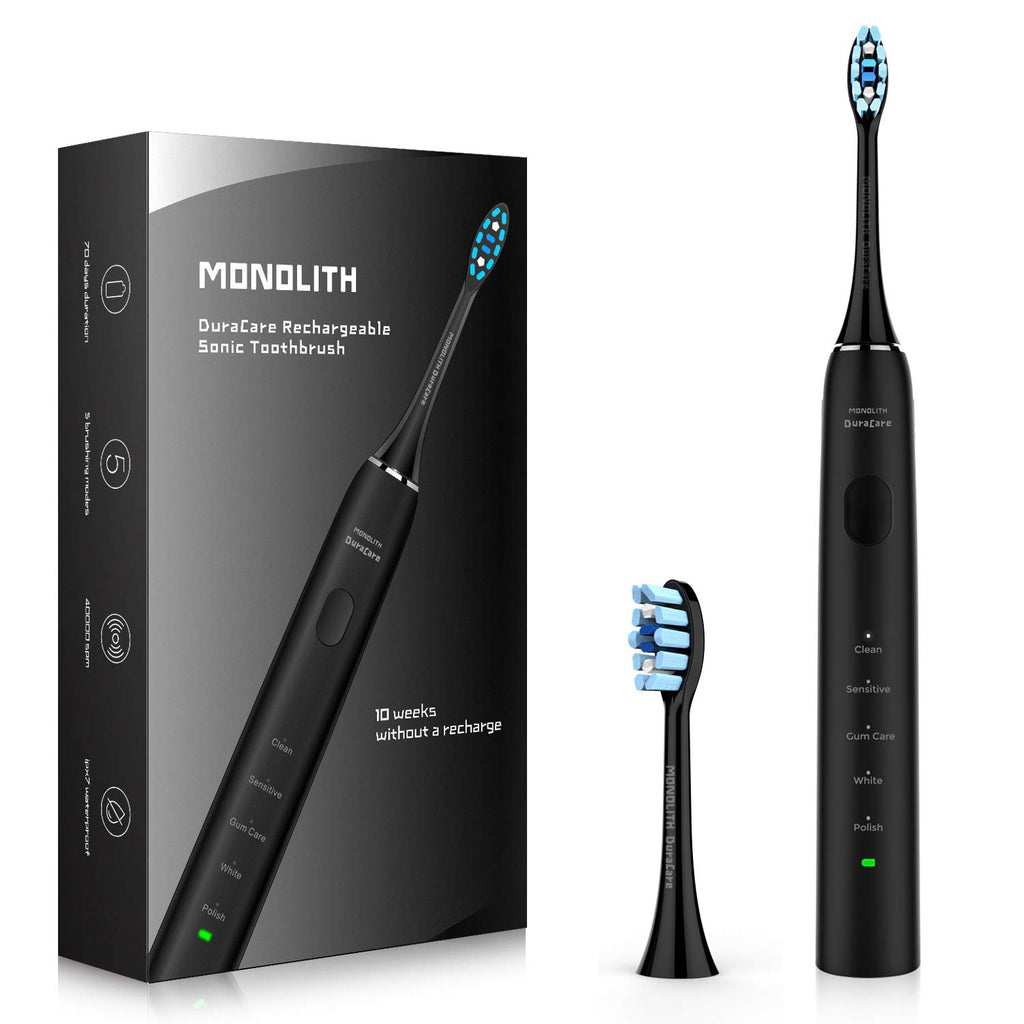 Monolith DuraCare 歯ブラシ、2x ブラシヘッド、USB充電ケーブル、取扱説明書。サイズ:約 高さ25×幅2.8×奥行2.9cm(ブラシ含む) 本体重量:131g ブラシ重量:8g